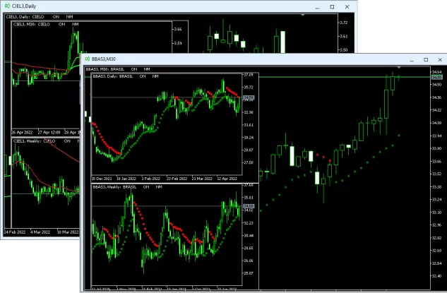 Com apenas 1 clique é possível o gráfico 3 tempos gráficos diferentes para quais quer dos indicadores. Essa representação é mundialmente conhecida como TRIPLE SCREEN (by Alexander Elder).